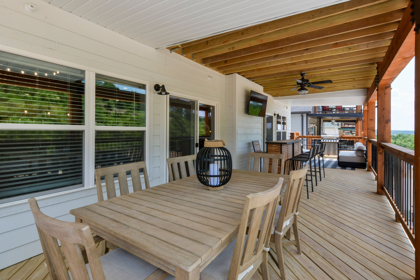 Luxury at its finest, with an amazing space for large groups to make great memories while still having privacy. 9 bedrooms - 8 King Bedrooms with private bathrooms (3 also have day beds with trundles) and 1 bunkroom with 9 bunks; 10 full bathrooms. Over 5k sq ft. Large fully equipped kitchen (2 full size refrigerators, 2 dishwashers, well-stocked) 3 covered decks (one off a private bedroom) Private hot tub for 6 Fire pit Outdoor & indoor community pools just a walk away Walking trail to the lake Great outdoor space Pool table Theater seating with 85" TV and surround sound A breathtaking summit community with amazing amenities and views. Three levels of amazing spaces await you and your crew! This stunning home is set up for fun and comfort. Whether outdoor spaces are your thing, or you prefer the comforts of the indoors, we've got you covered! Located in the brand new Branson resort, Lodges at Chateau Cove, your best vacation is waiting on you. Upon completion, this home will feature 8 private bedrooms, 1 awesome bunkroom with 9 bunks and 10 full bathrooms. This setup provides plenty of room for everyone to be together, while maintaining privacy, even with large groups! Enjoy some time outside in the fresh air, sipping coffee on the patio, having a drink by the firepit, or just decompressing in the hot tub. Need to cool off? No worries, you're staying in the closest house to the new indoor pool and splash pad in the Lodges at Chateau Cove. Want to get a little sun? No problem, we've also got an outdoor pool a short walk away. At this home, up to three pets are allowed for an additional fee. Please let us know that you are bringing the pets at the time of your booking. Main Level Living Area - Large Smart TV, electric fireplace Dining Room with 2 large dining tables that seat 24, a 12+ ft bar and island that seat an additional 12 Full Kitchen - 2 fridges, double oven, range, 2 dishwashers (cause who wants to do dishes on vacation?) Bedroom 1 with Attached Bath King Bed, Day bed w/ trundle, Flat Screen TV Bedroom 2 with Attached Bath King Bed, Flat Screen TV, Handicapped Accessible Walk-In Shower Bath 3 Full Bath Laundry Room with full-size Washer and Dryer Grand deck with seating and outdoor dining space and grill Open concept with lots of natural light **Main level is accessible with a ramp to the front door, handicap accessible bedroom and bathroom Lower Level Living Area - 85" TV & Theater Seating with surround sound Pool Table & Bar Seating Bedroom 3 with Attached Bath King bed, Flat Screen TV Bedroom 4 with Attached Bath King bed, Flat Screen TV Bedroom 5 with Attached Bath King Bed, Flat Screen TV Bunk Room with Attached Bath Bunk Room with 9 Twin Beds - a favorite for the kids/teens! (Each bunk has its own outlet so they can charge their gadgets!) Full-size Washer and dryer Patio with hot tub and firepit Upper Level Bedroom 7 with Attached Bath King Bed, Flat Screen TV, day bed with trundle, private balcony Bedroom 8 with Attached Bath King Bed, Flat Screen TV, day bed with trundle Bedroom 9 with Attached Bath King Bed, Flat Screen TV Outdoor Amenities Private Hot Tub on the patio for 6 Fire Pit Outdoor living furniture Propane grill Patio & 2 decks Resort Amenities Outdoor Pool (Available only to guests staying at the resort) Playground Hiking Trail to Table Rock Lake Indoor Pool/Splash pad (located directly next to this lodge) You'll have access to the entire property and amenities with the exception of a locked owners closet.