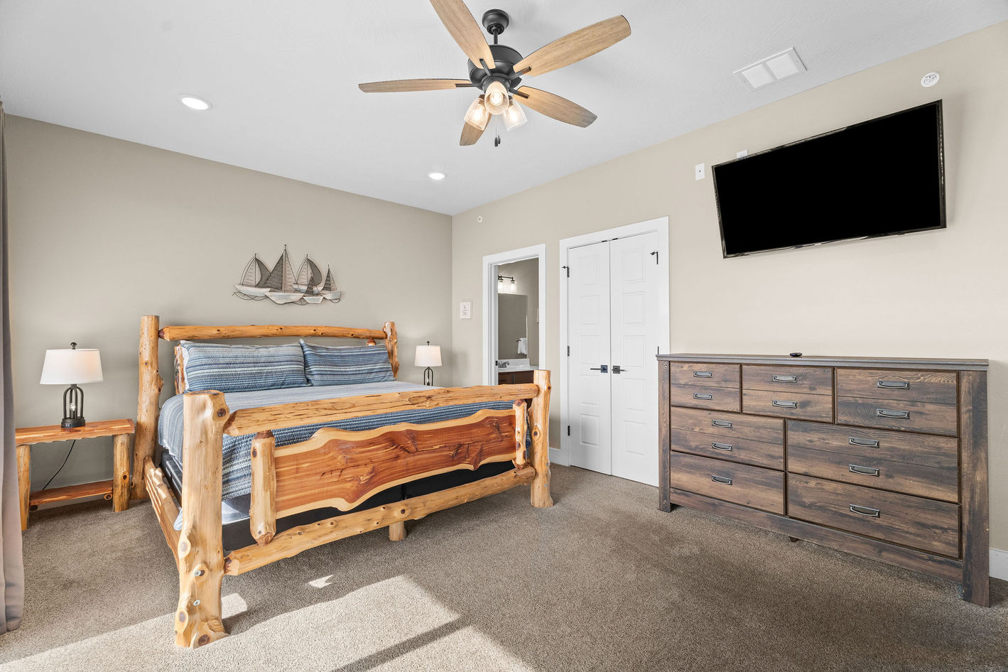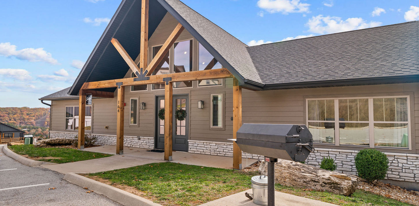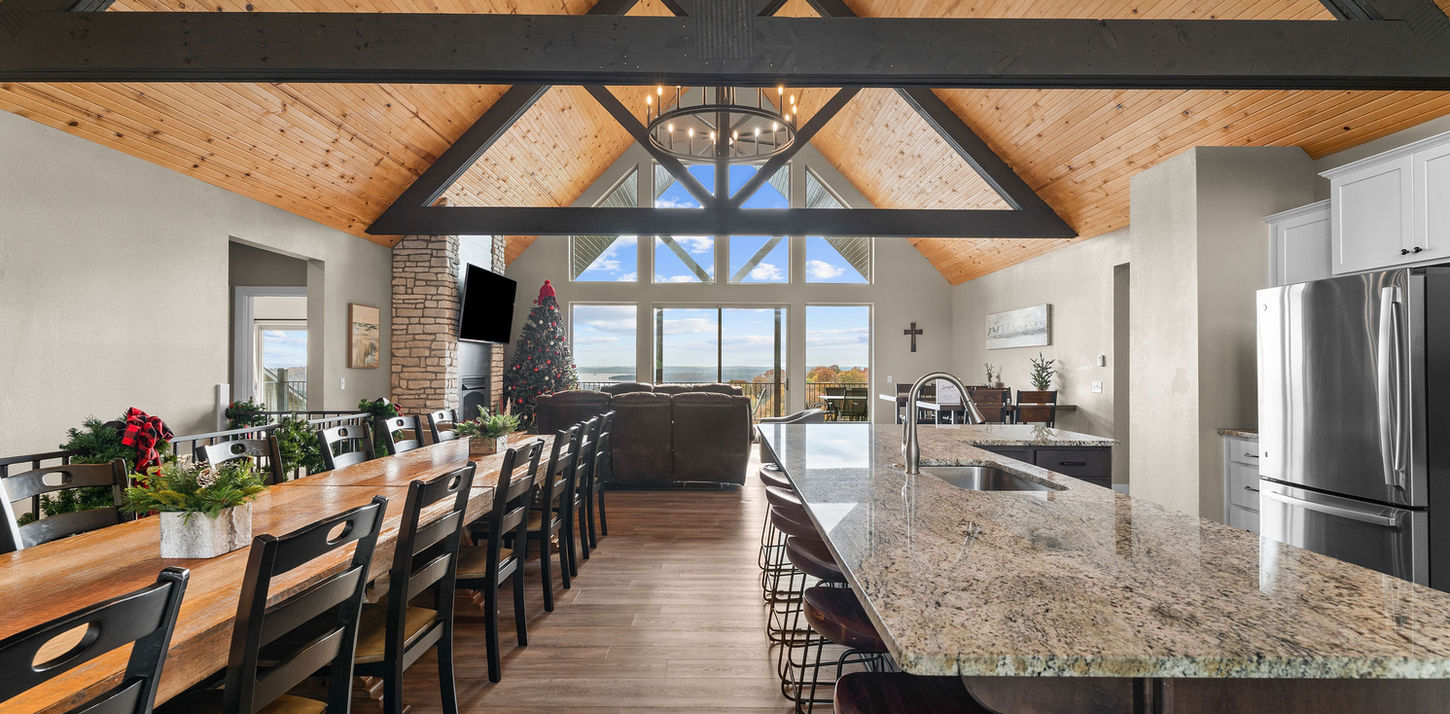 Wake up to peaceful Ozark mountain air, pour a cup of coffee, and step onto the expansive two-story deck while taking in breathtaking views of Table Rock Lake. Inside, you’ll find soaring wood-beam vaulted ceilings, floor-to-ceiling stone fireplaces, and entertainment for the kids! HOME OVERVIEW - 8 bedrooms | 8 bathrooms - Sleeps up to 32 guests - Dining seating for up to 32 - Beautiful lake and mountain views COMMUNITY AMENITIES - Community indoor pool (open year-round) - Community outdoor pool (open seasonally) - Hot tub - Playground - Deck seating INDOOR LIVING AND ENTERTAINMENT - Spacious great room with vaulted ceilings and a wall of windows - Main-level fireplace - Lower level rec room w/ pool table, golden tee golf, mini pinball - TV's in all bedrooms - Wi-Fi - Fully stocked kitchen with double refrigerators - Lower level kitchenette w/ another fridge - Two sets of full-size washers and dryers (laundry soap provided) OUTDOOR LIVING - Two large decks with outdoor dining seating - Charcoal grill - Incredible views of Table Rock Lake BEDROOM LAYOUT Main Level: - Bedroom 1: King bed with daybed and trundle, ensuite bathroom - Bedroom 2: King bed with twin over twin bunk bed, ensuite bathroom - Bedroom 3: King bed with daybed and trundle, ensuite bathroom - Bedroom 4: King bed with daybed and trundle, ensuite bathroom Lower Level: - Bedroom 5: Two king beds, ensuite bathroom - Bedroom 6: Two king beds, ensuite bathroom - Bedroom 7: Two king beds, ensuite bathroom - Bedroom 8: Two king beds, ensuite bathroom Total beds: 12 king beds, 3 daybeds and trundle, 2 twins LOCATION HIGHLIGHTS - Silver Dollar City – 1.3 miles Amusement park rides, festivals, and concerts - Indian Point Marina – 2.5 miles Boat rentals, jet skis, fishing, boat launch, and Floating Café - Branson 76 Strip – 10 miles Titanic Museum, Dolly Parton’s Stampede, Sight & Sound Theatres, shopping, dining, mini golf, go-carts, and more - Table Rock State Park – 9.2 miles - Dogwood Canyon Nature Park – 21.3 miles AIRPORTS - Branson Airport – 25 miles - Springfield National Airport – 55 miles
