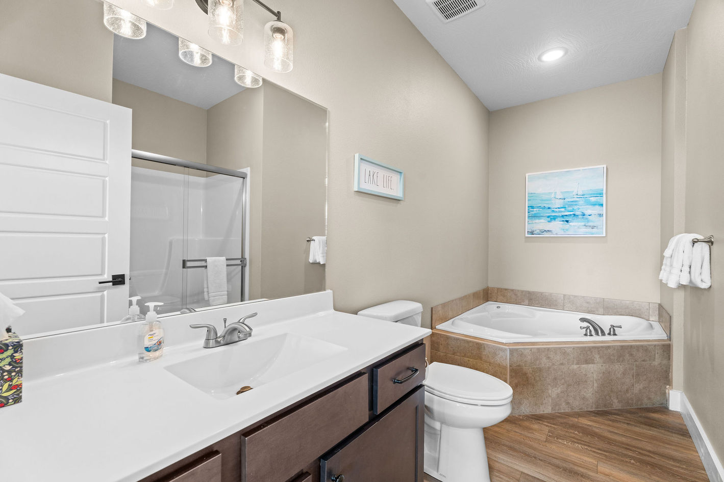Bathrooms have hair dryers and are stocked with guest bath towels, toilet paper, shampoo, conditioner, soap, body wash. (Please bring your own towels for use at the pool, lake, etc.)